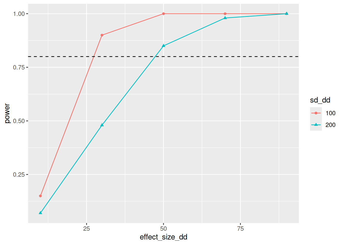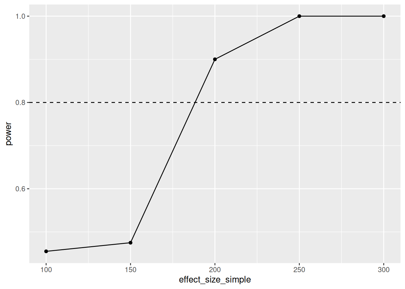as_tibble()When we plot the results, it seems sample size doesn’t affect power much