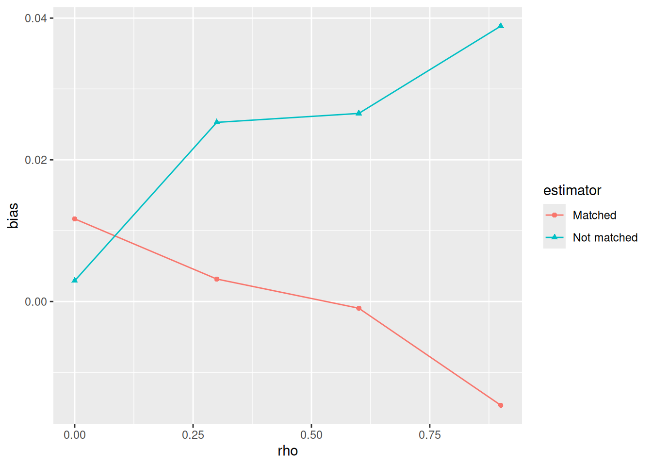 It’s useful to explore the property’s of our matching estimator. First I draw data based on my design and create matched version of that data.